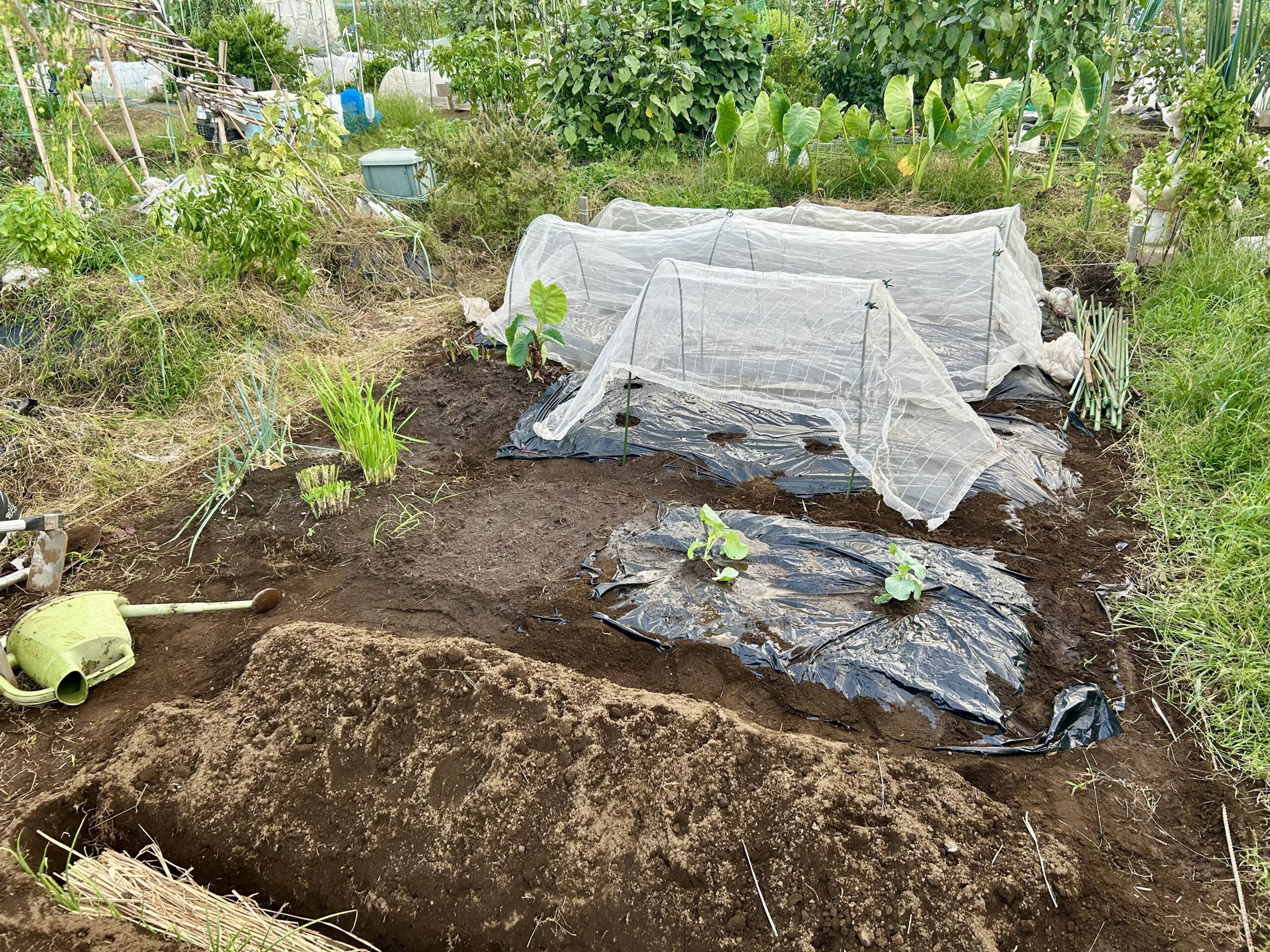 畝を整えて、黒マルチを張る。穴あけを使って、2列、30cm間隔で穴を開ける。人差し指で土を押して、小さな穴を開ける。種を5粒入れて、土で埋める。ジョウロで水をかける。虫除けネットを張って完了。まずは1週間以内に芽を出すかだ。頑張れ。
